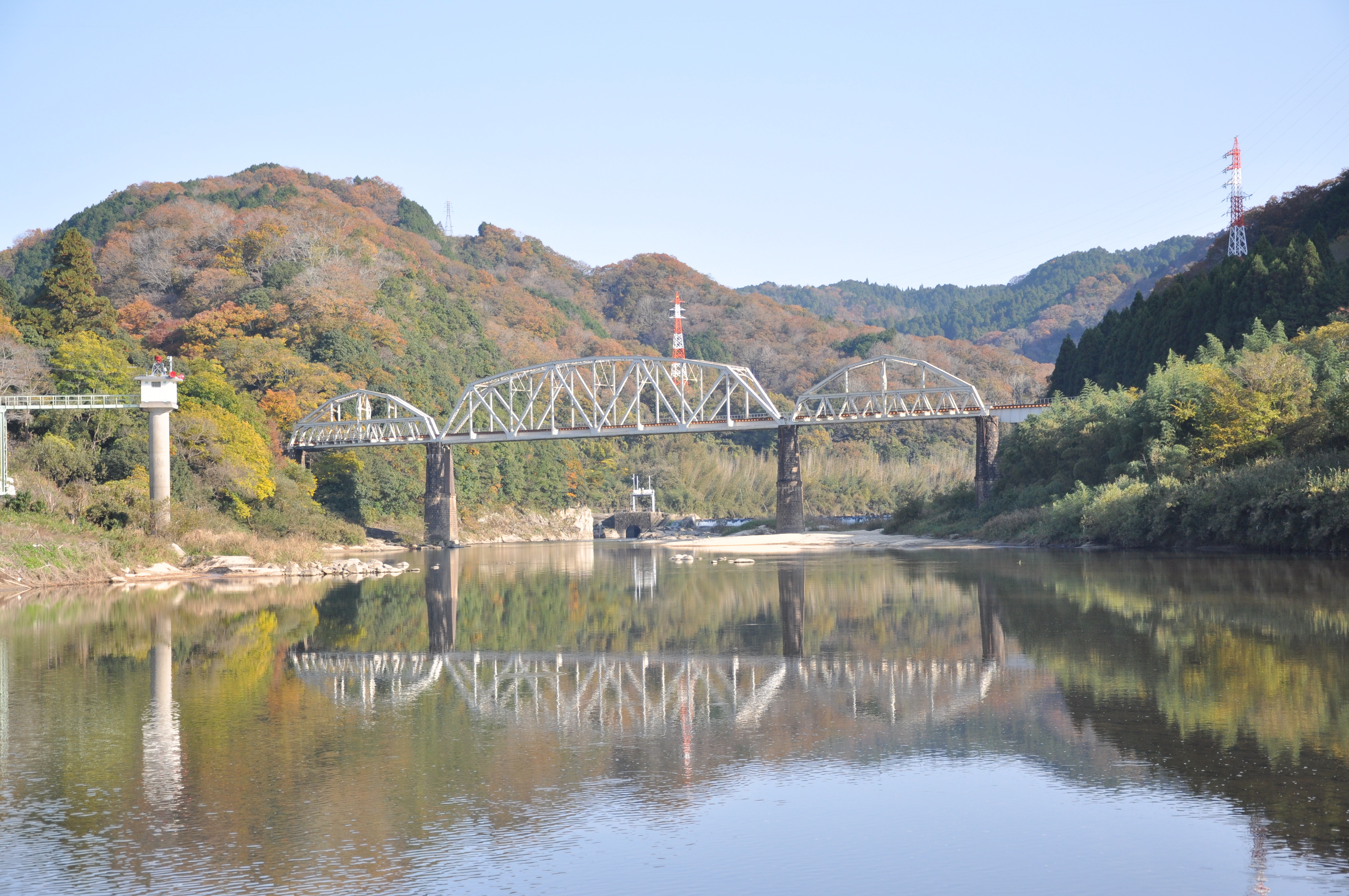 This is a huge iron bridge crossing the Kizu River.  It was completed in 1897.  The abutment and piers were made of stone blocks and bricks, which remain as they were more than 100 years ago.  This bridge was designated as a JR West Japan Registry of Railroad Cultural Assets on October 14th, 2009.
