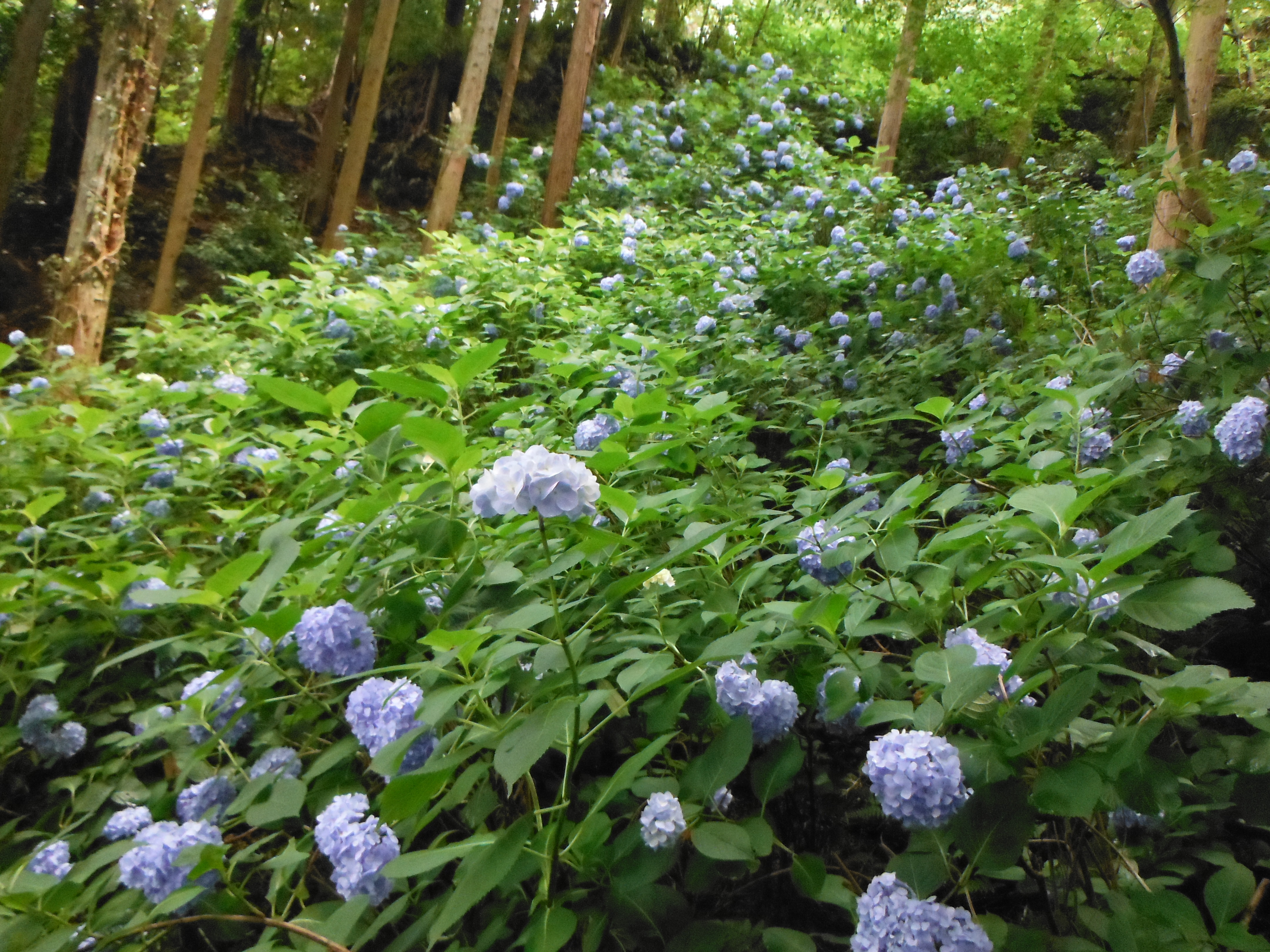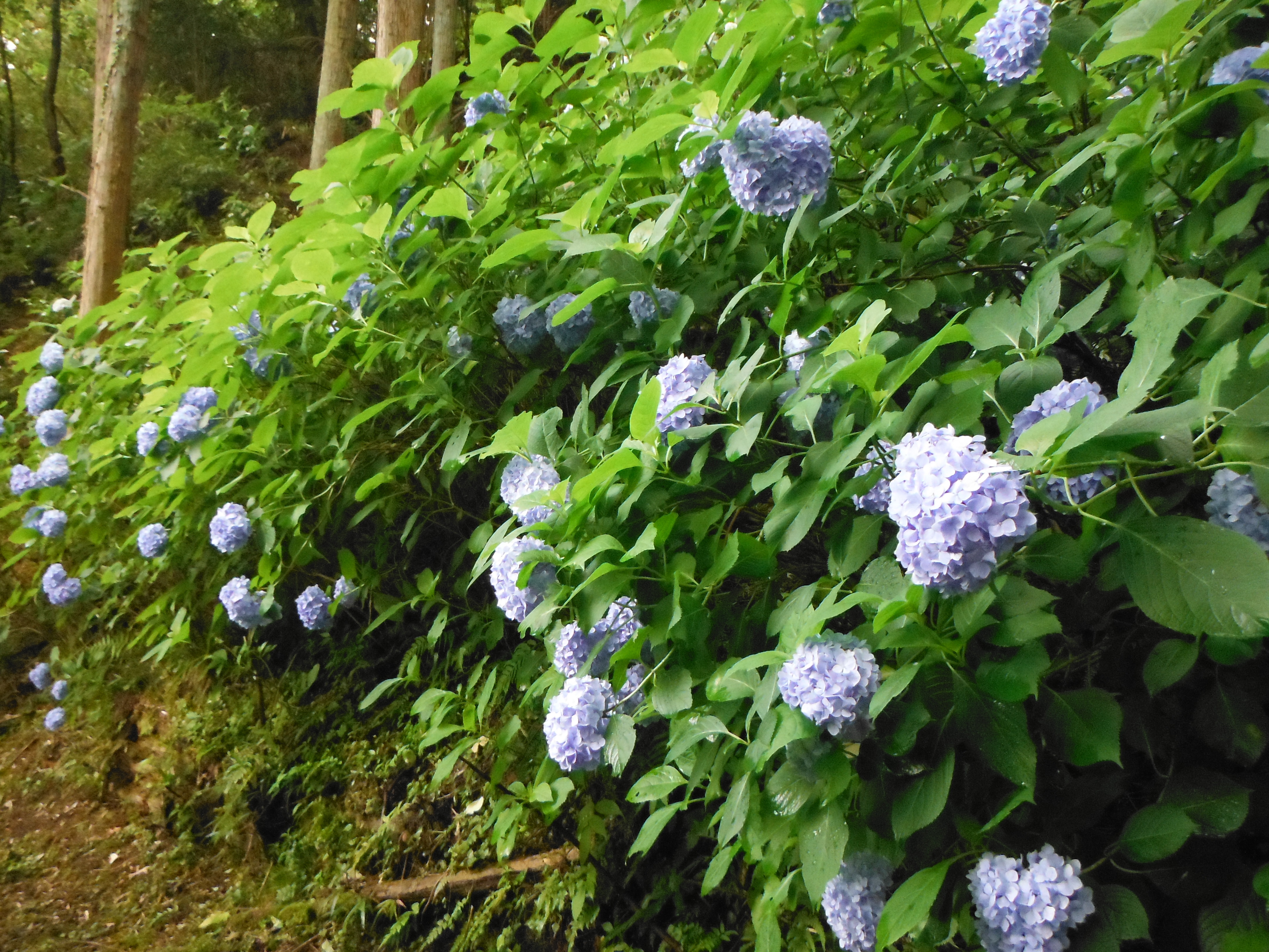 If you walk on the Tokai Long-Distance Footpath from the stone steps near the main gate of Kasagi Temple for just 2 minutes, you will reach a hydrangea cluster, covering the hillside, spotted with tall cedar trees.  The local people have spent many years increasing the number of hydrangea trees by laboriously planting or grafting cuttings.  In the rainy season, all of the hillside is colored in blue.  It has become a hidden beauty spot for those in the know.