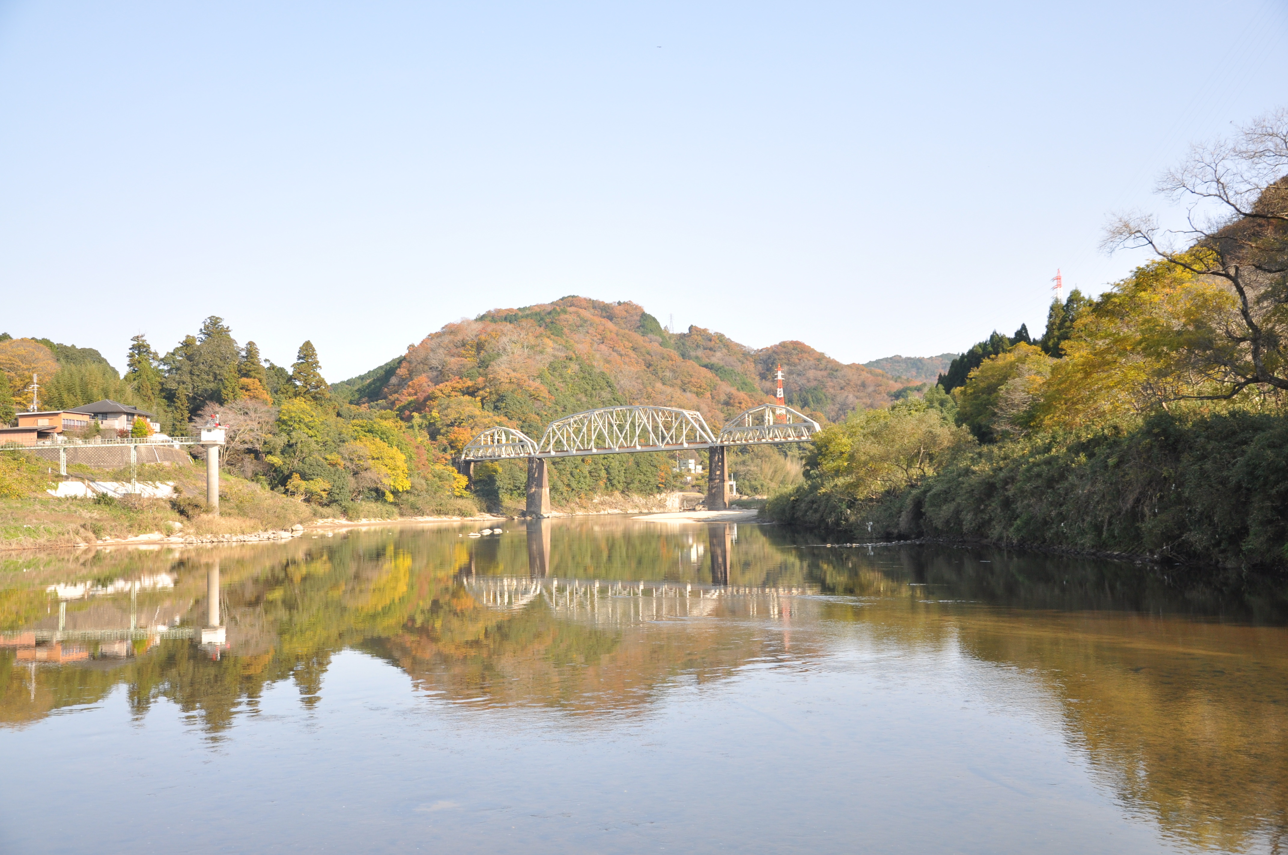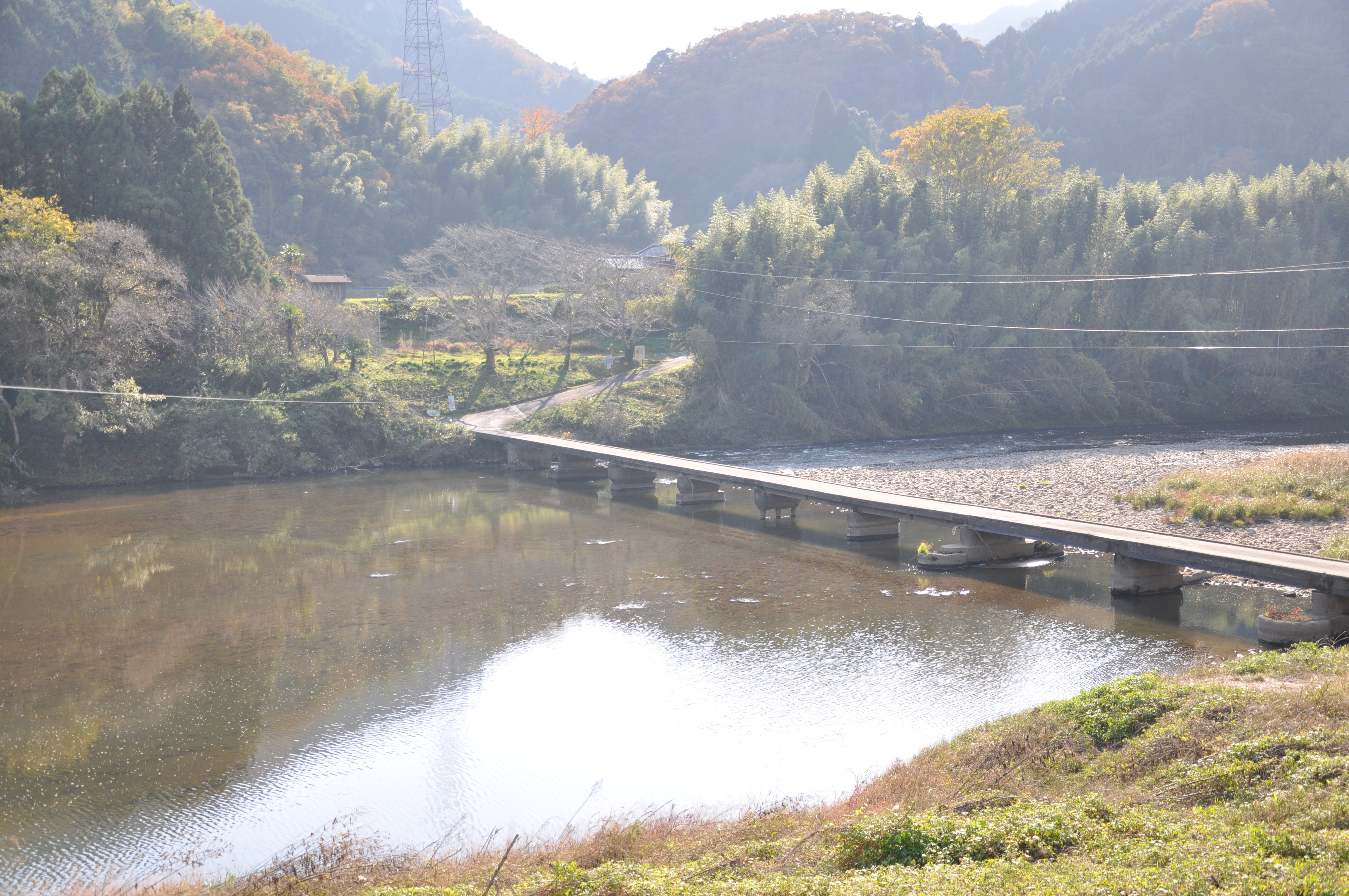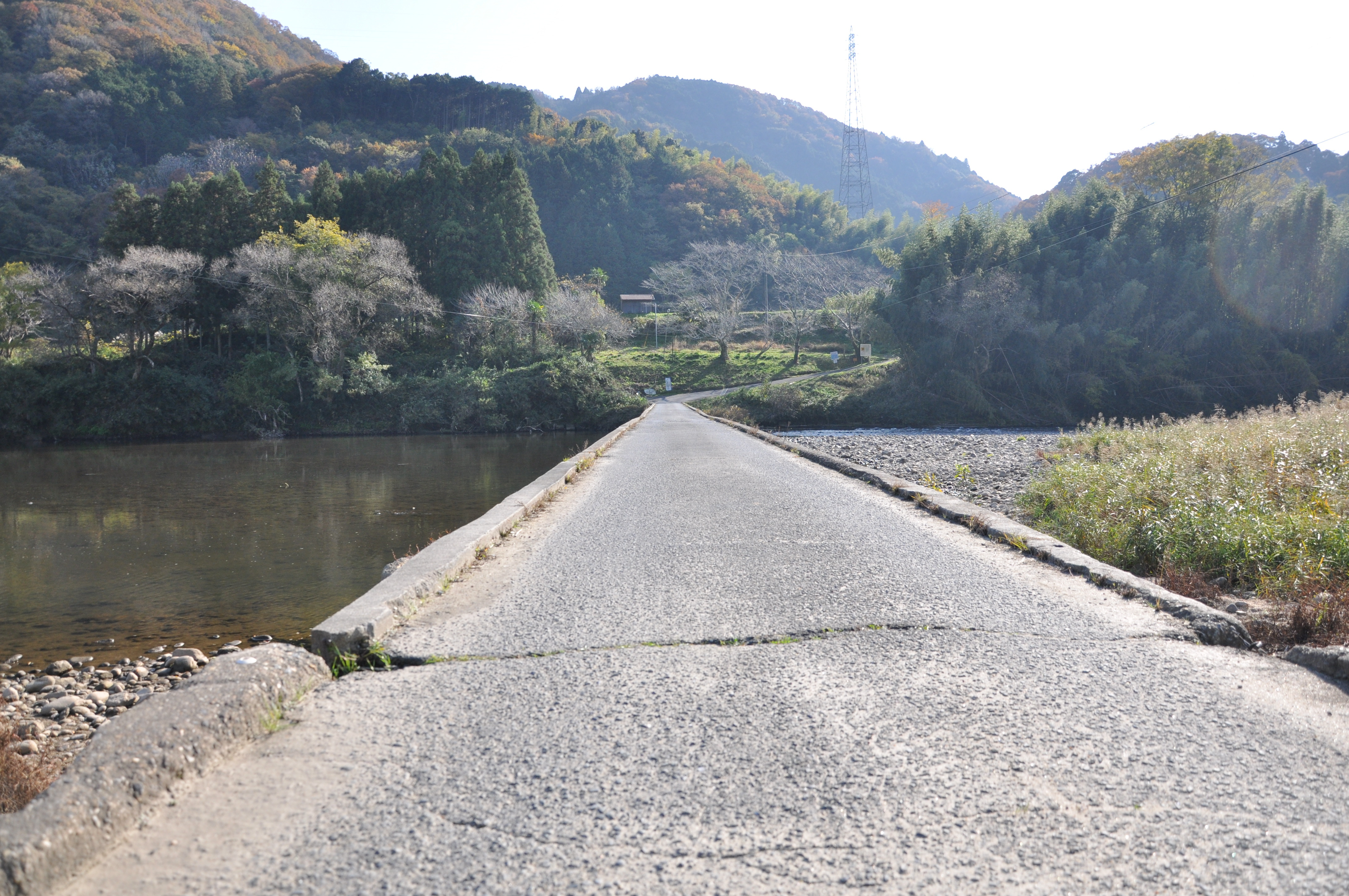 飛鳥路地区内を抜けて、木津川を横断して対岸へ向かうコースです。木津川に架かる橋は「潜没橋(せんぼつきょう)」といい、大雨で木津川の水量が上がると沈んでしまう珍しい橋です。