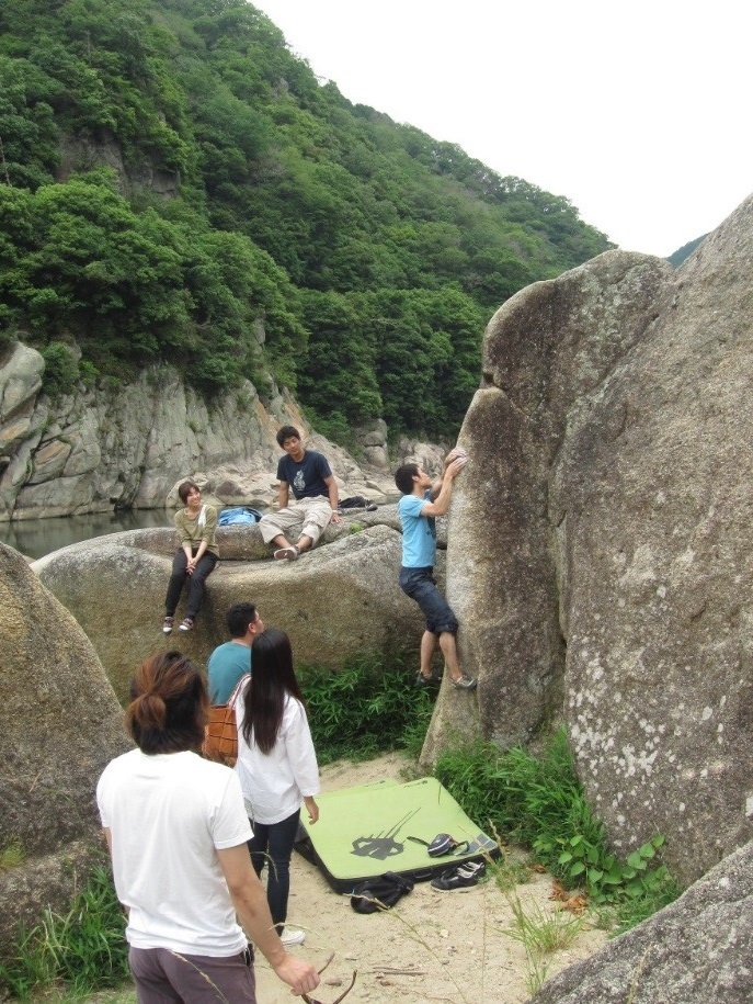 笠置橋上流に広がるボルダリングエリアでは、大小の岩がゴロゴロしていて、関西屈指と言われています。ランディングも良く、多彩なコースは初級者から上級者まで楽しむことができます。