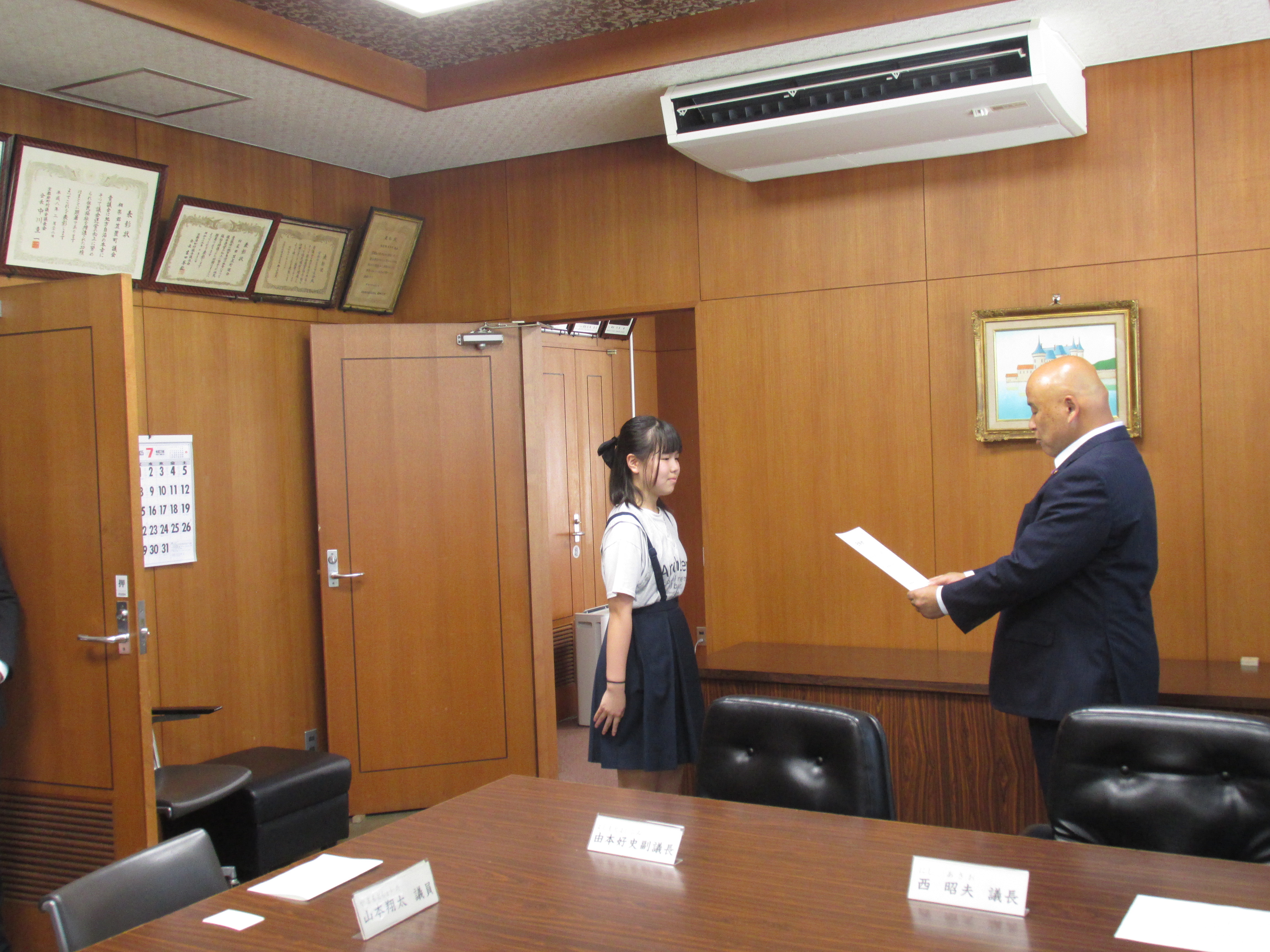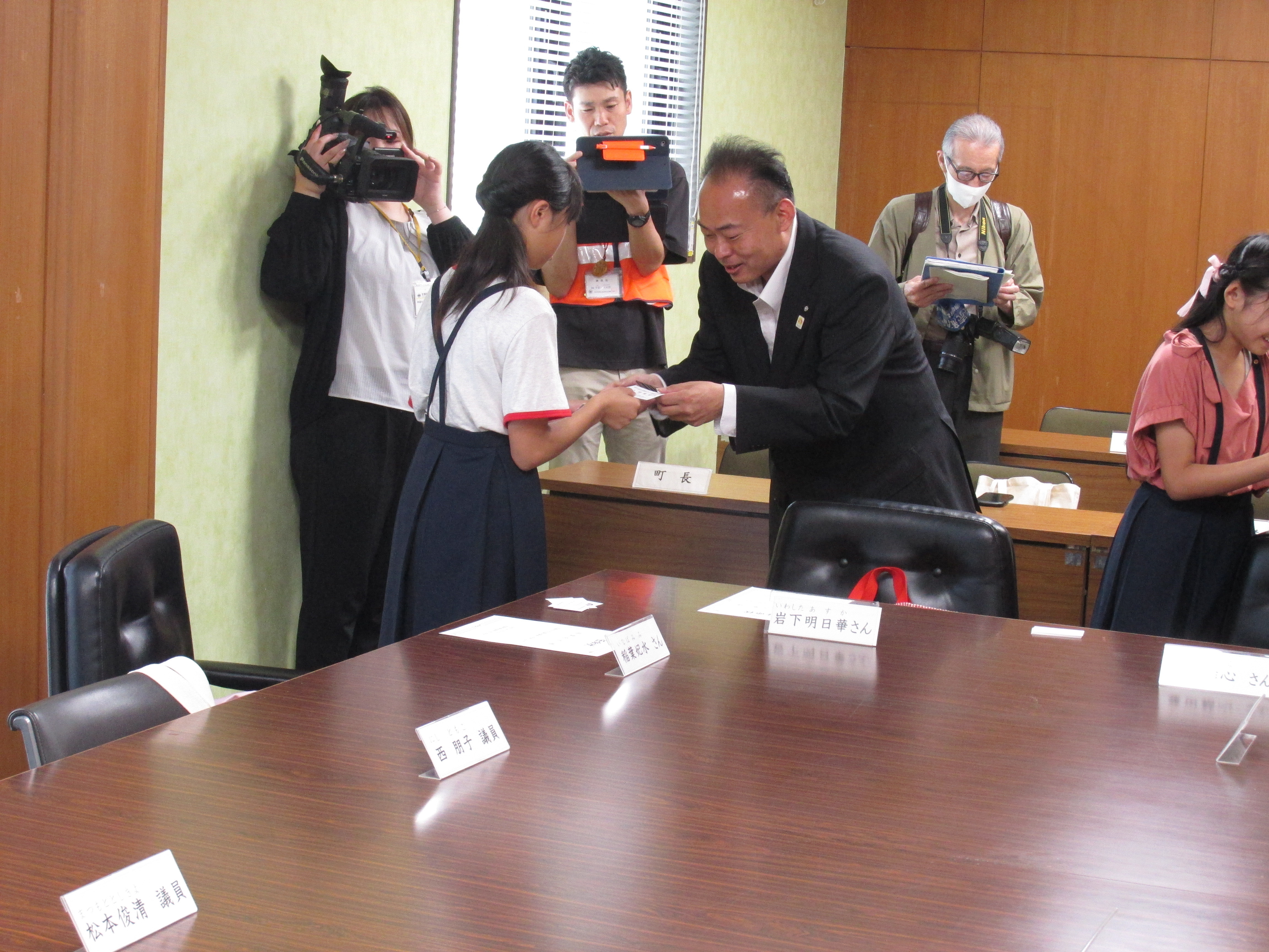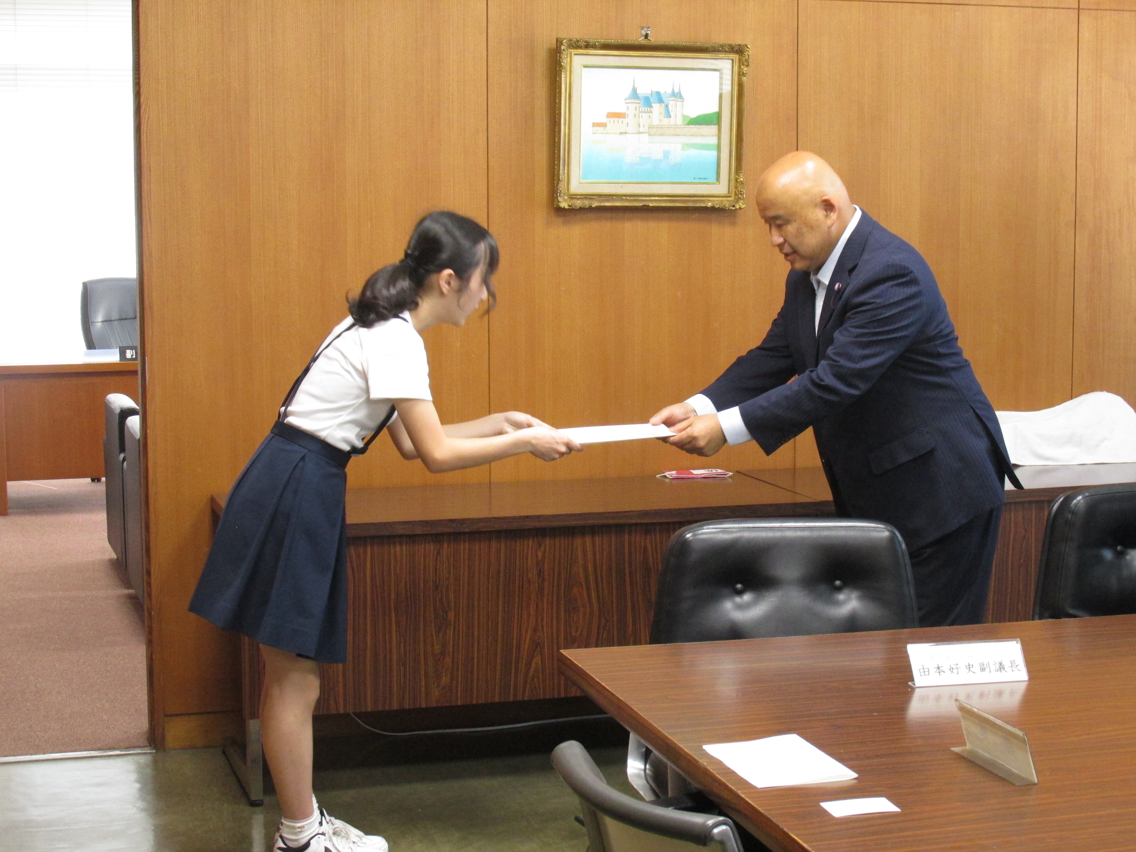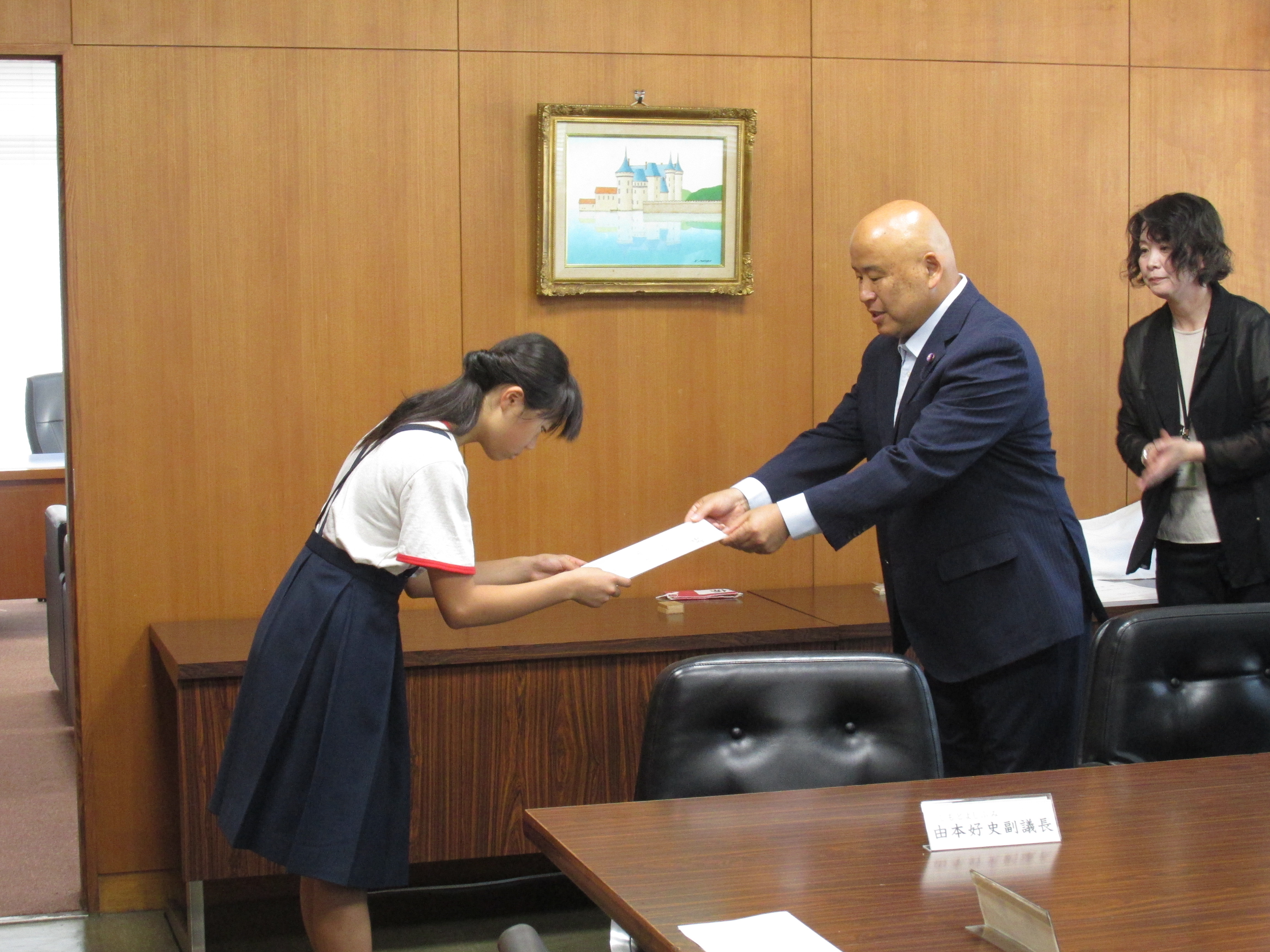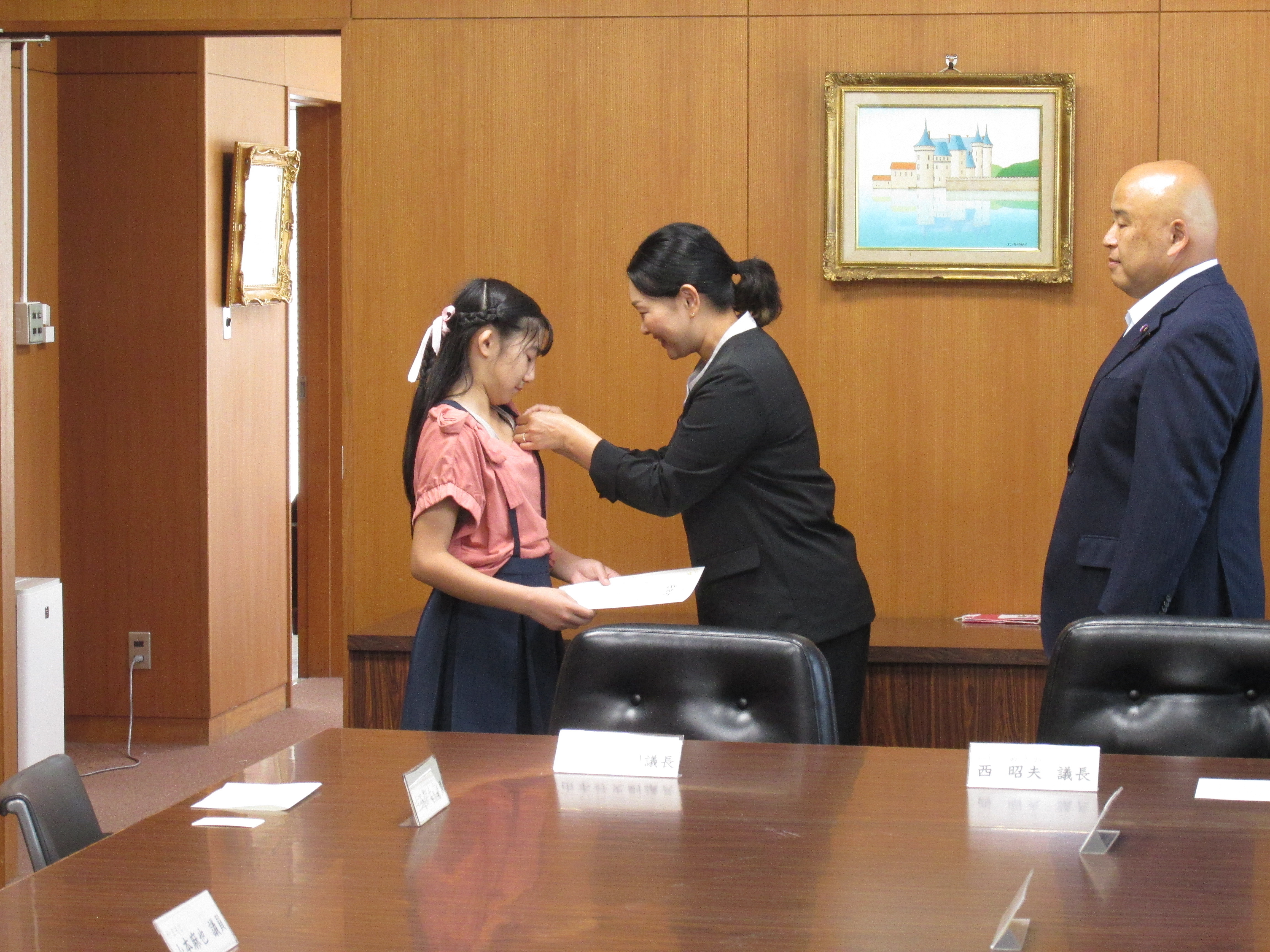 子ども議会当日、議長から子ども議会議員に任命、議員記章(略章)を貸与しました。